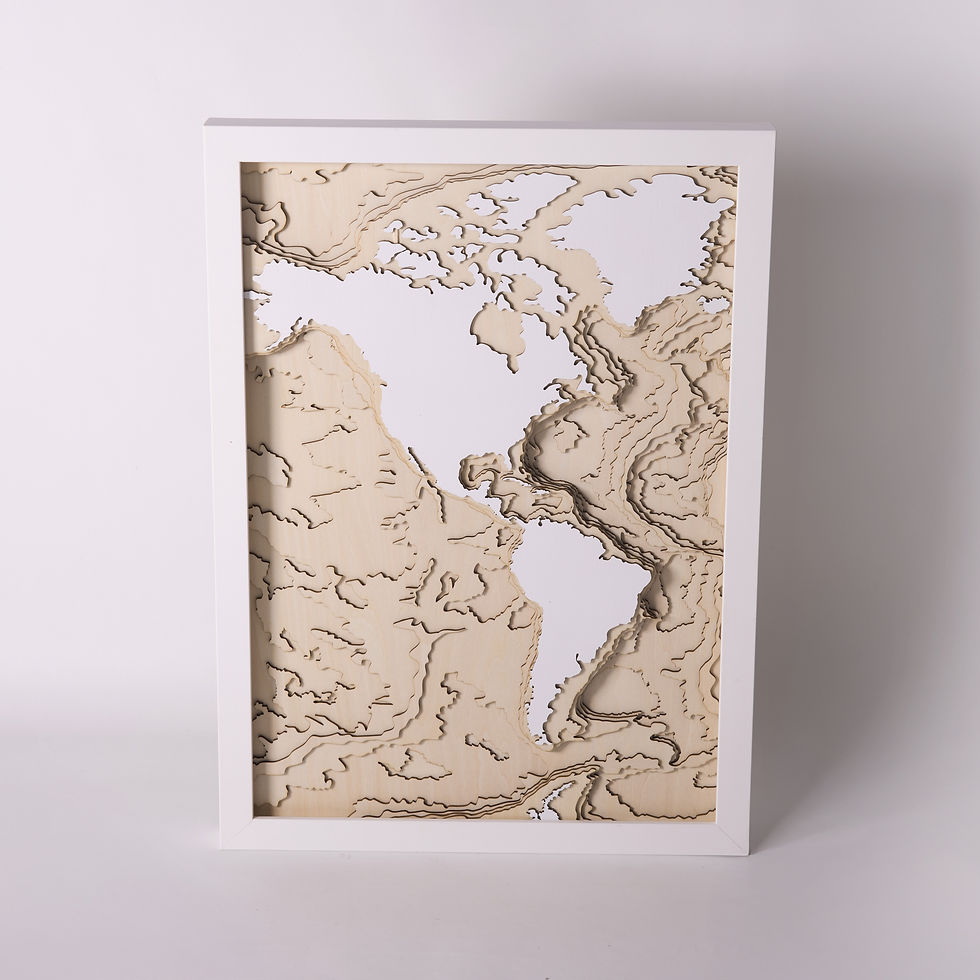 Each map is meticulously designed using real bathymetric ocean charts and cut from 2mm sustainably sourced basswood ply, layered to bring the land and water to life.